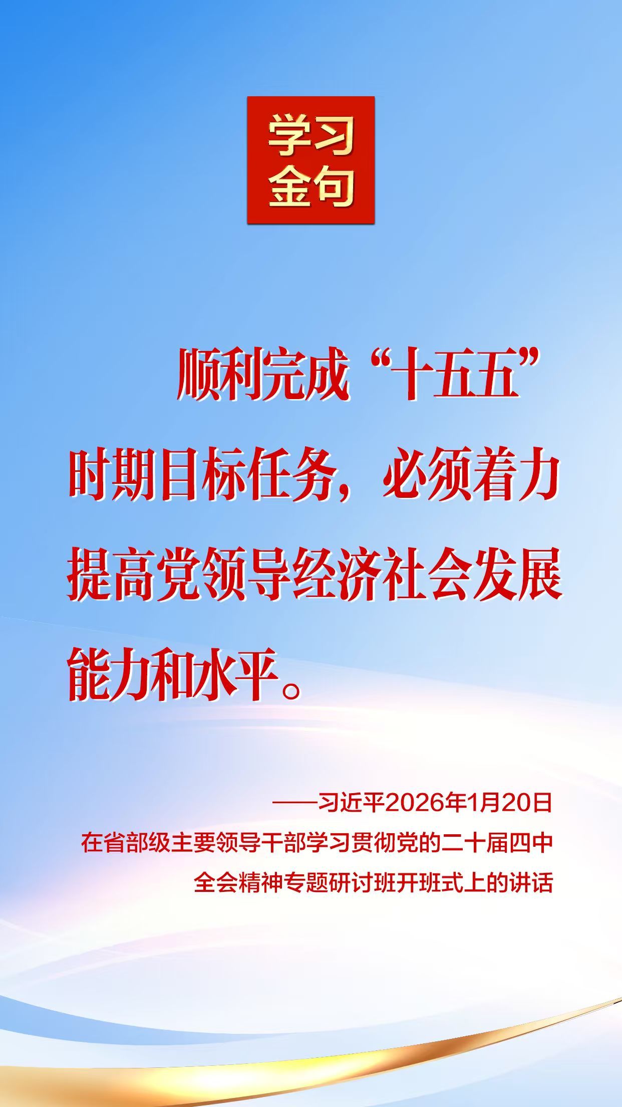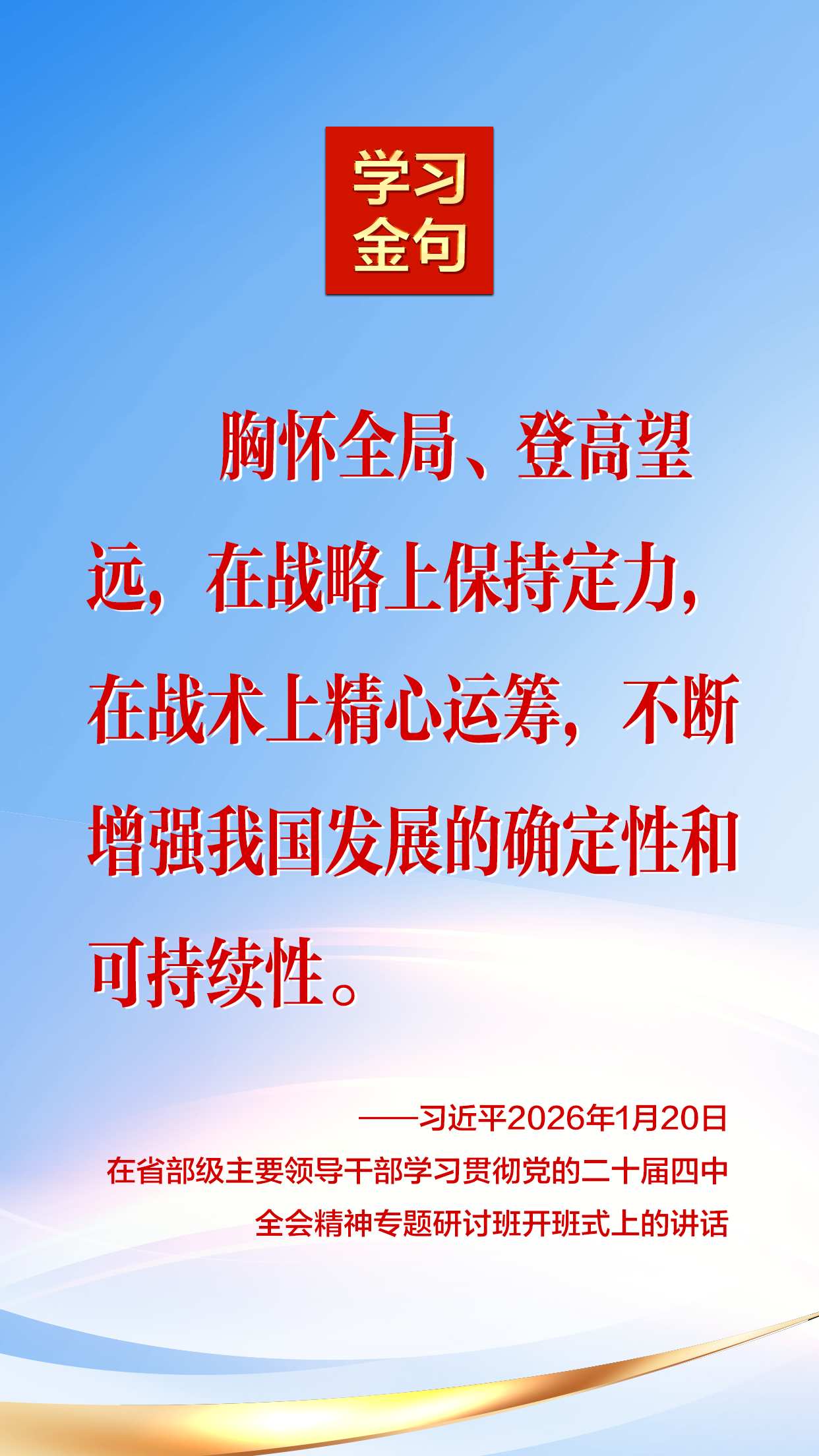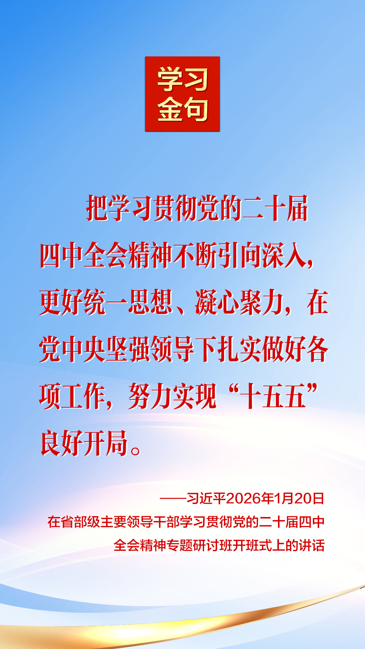 2026年1月20日,中共中央总书记、国家主席、中央军委主席习近平在省部级主要领导干部学习贯彻党的二十届四中全会精神专题研讨班开班式上发表重要讲话。 我们摘录了部分内容,一起来学习!